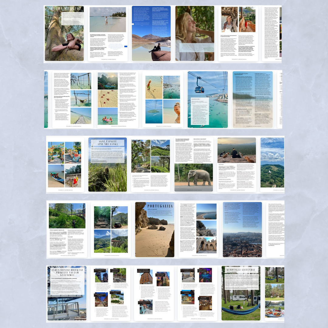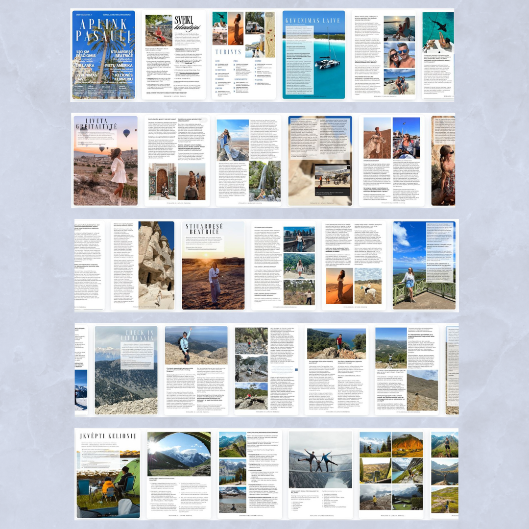 Skaitmeninis kelionių žurnalas - 85-ių puslapių leidinys, pilnas įkvepiančių istorijų, nuotykių, pasakojimų. Visada turėsite po ranka, savo telefone, ir galėsite atsiversti bet kur: traukinyje, automobilyje, lėktuve, eilėje, autobuse, nuobodžiaujant ar pritrūkus įkvėpimo.